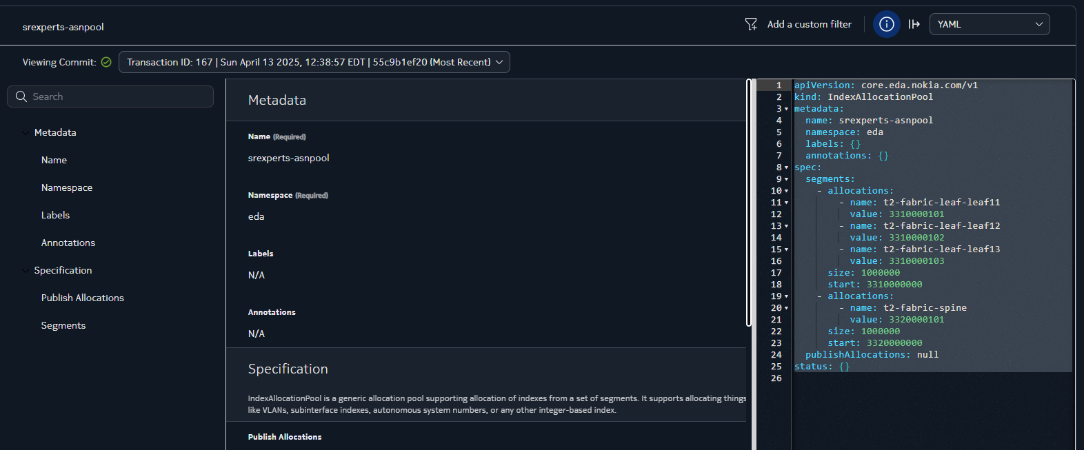 The command outputs the YAML definition of the ASN allocation pool, including any pre-defined allocations. For example:apiVersion: core.eda.nokia.com/v1 kind: IndexAllocationPool metadata: creationTimestamp: "2025-04-07T14:03:46Z" generation: 5 name: srexperts-asnpool namespace: eda resourceVersion: "1145904" uid: 2b1ec70a-3d9d-404b-8493-f87640d43638 spec: publishAllocations: true segments: - allocations: - name: srexperts-fabric-spine value: 4200001000 size: 1000 start: 4200001000