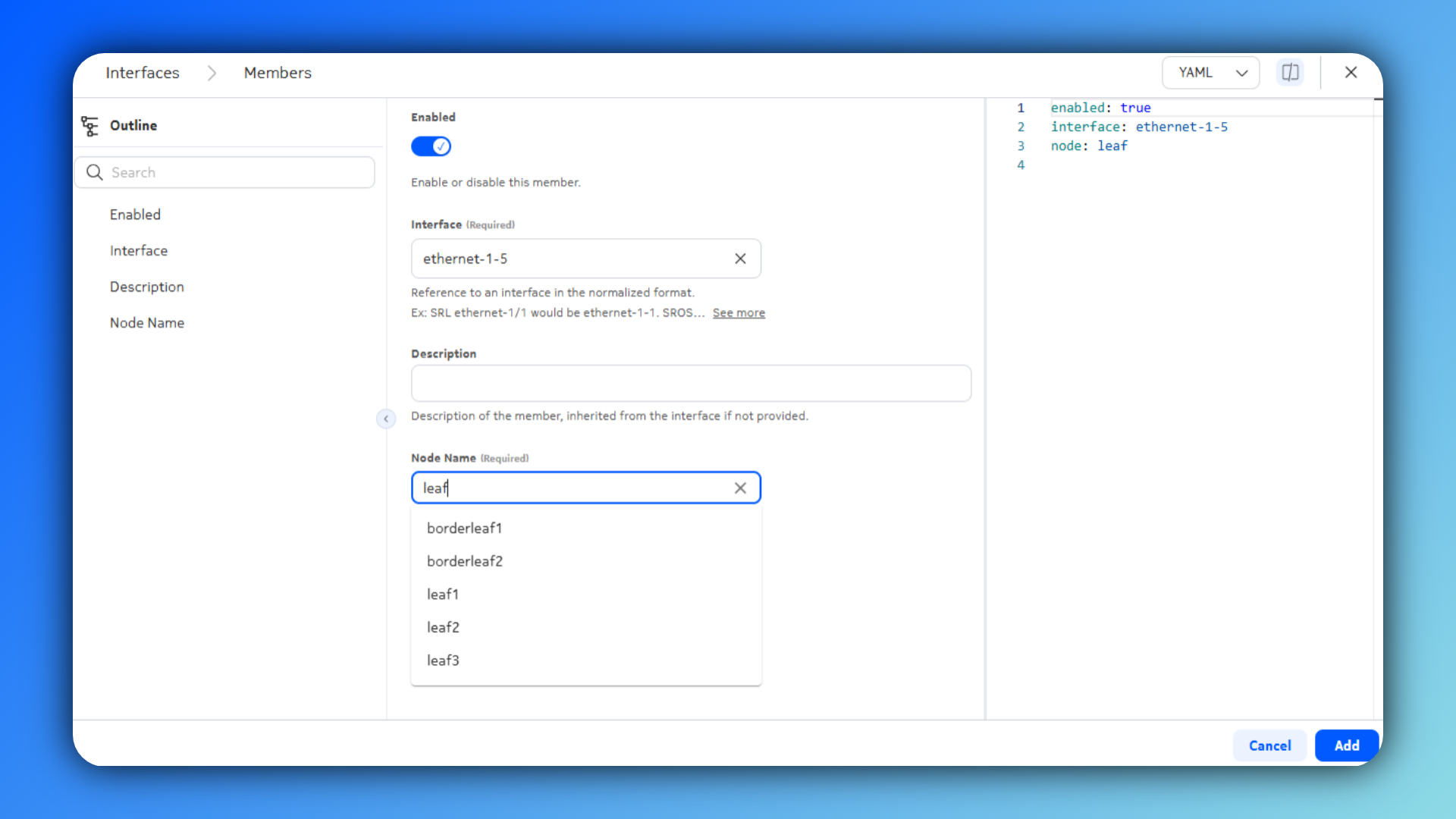 For example, since we are tasked to create an interface ethernet-1/5 on all leaf switches, for leaf1 we might want to name the interface resource asleaf1-ethernet-1-5. - Specification → Members: a list of the port name + node name combinations that identify what ports to configure on which nodes