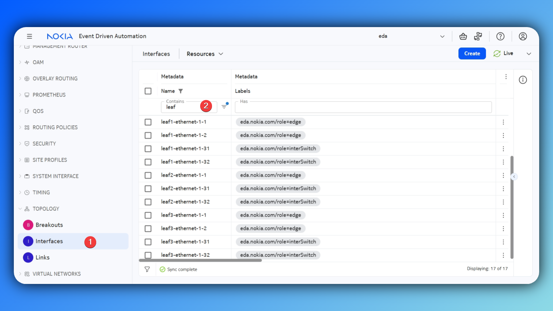 These nodes already have a number of interfaces configured, let's find out what they are. Since EDA acts as a source of truth for all configuration on the managed nodes, we should see the list of already configured interfaces in the UI.