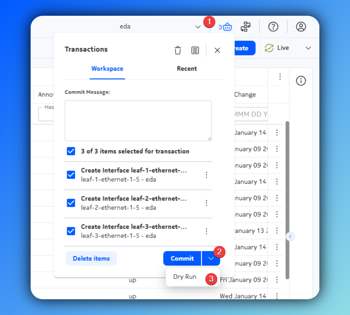 Once you added three interfaces to the transaction bucket you can Dry Run the transaction and see what your intended changes would look like.