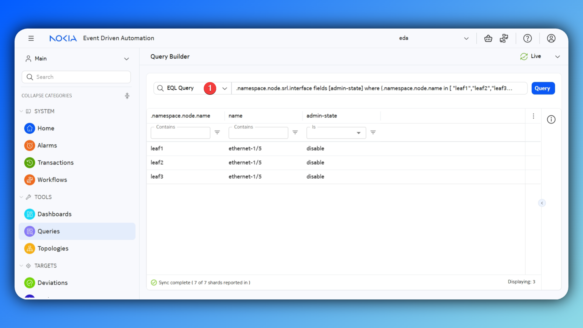In a moment you will see a confirmation that the transaction was committed successfully. Now you can repeat the EQL query and check the admin state of the ethernet-1/5 interface on all three nodes. They all should be enabled now.