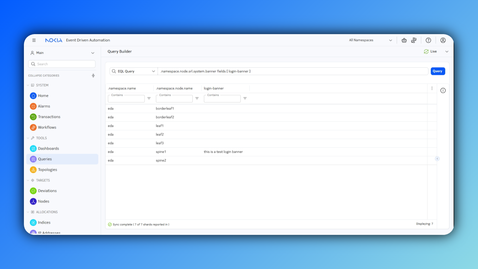 /system/banner/login-bannerfield from all SR Linux nodes managed by EDA.