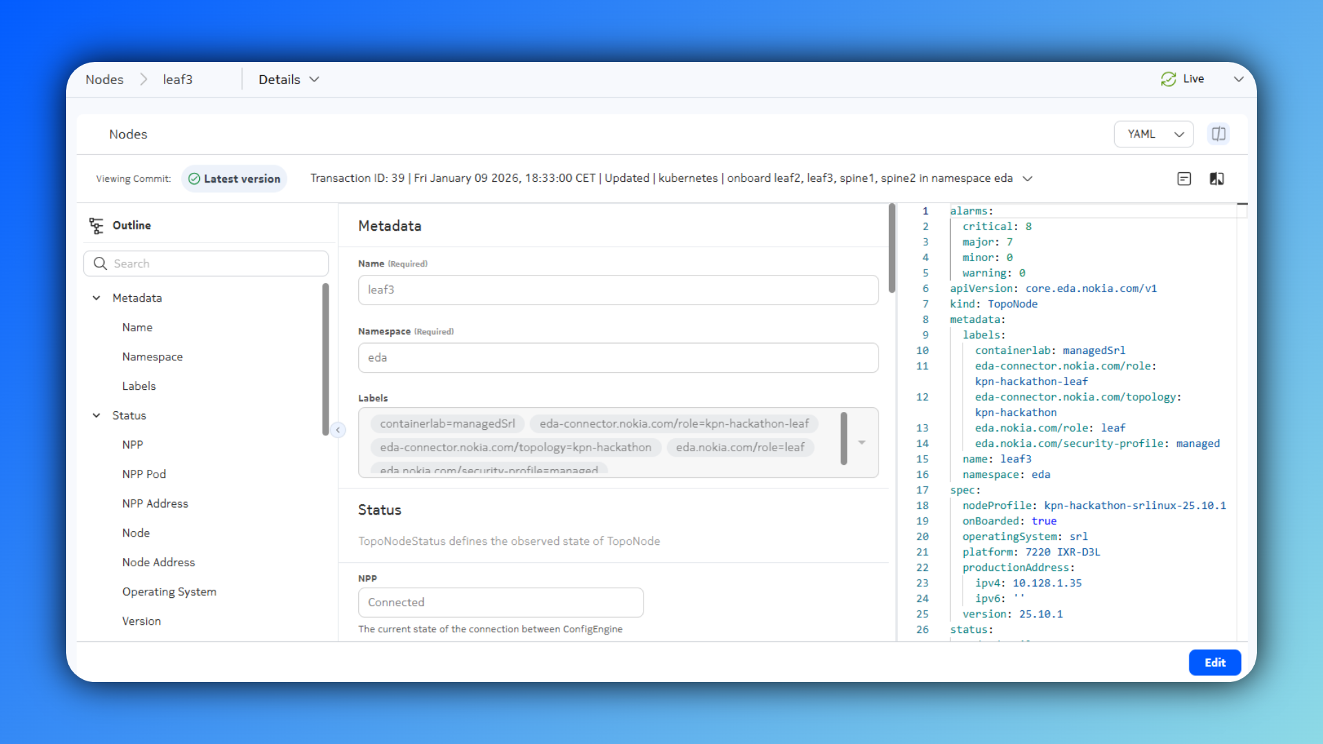 When onboarding the nodes of the topology to EDA we manually assigned labels to each nodes to identify their role and make it possible for EDA to select the nodes for the intents based on these labels.