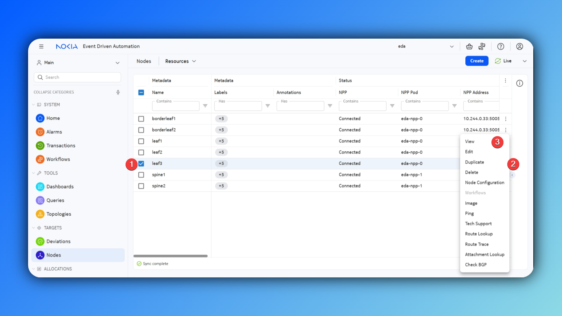 Have one more look at the diagram above that depicts a leaf-spine topology managed by EDA and let's find this list of nodes in the EDA UI.