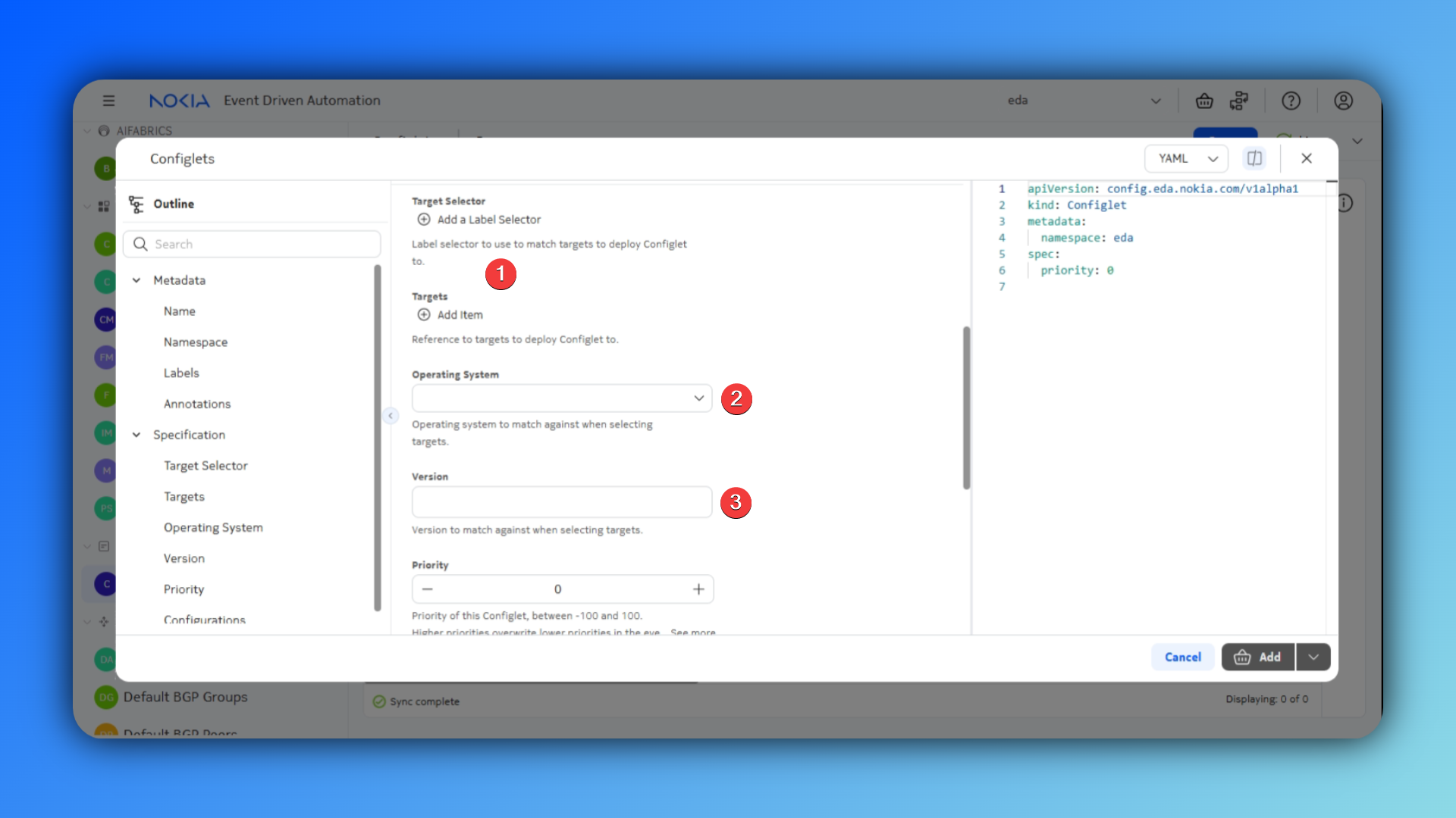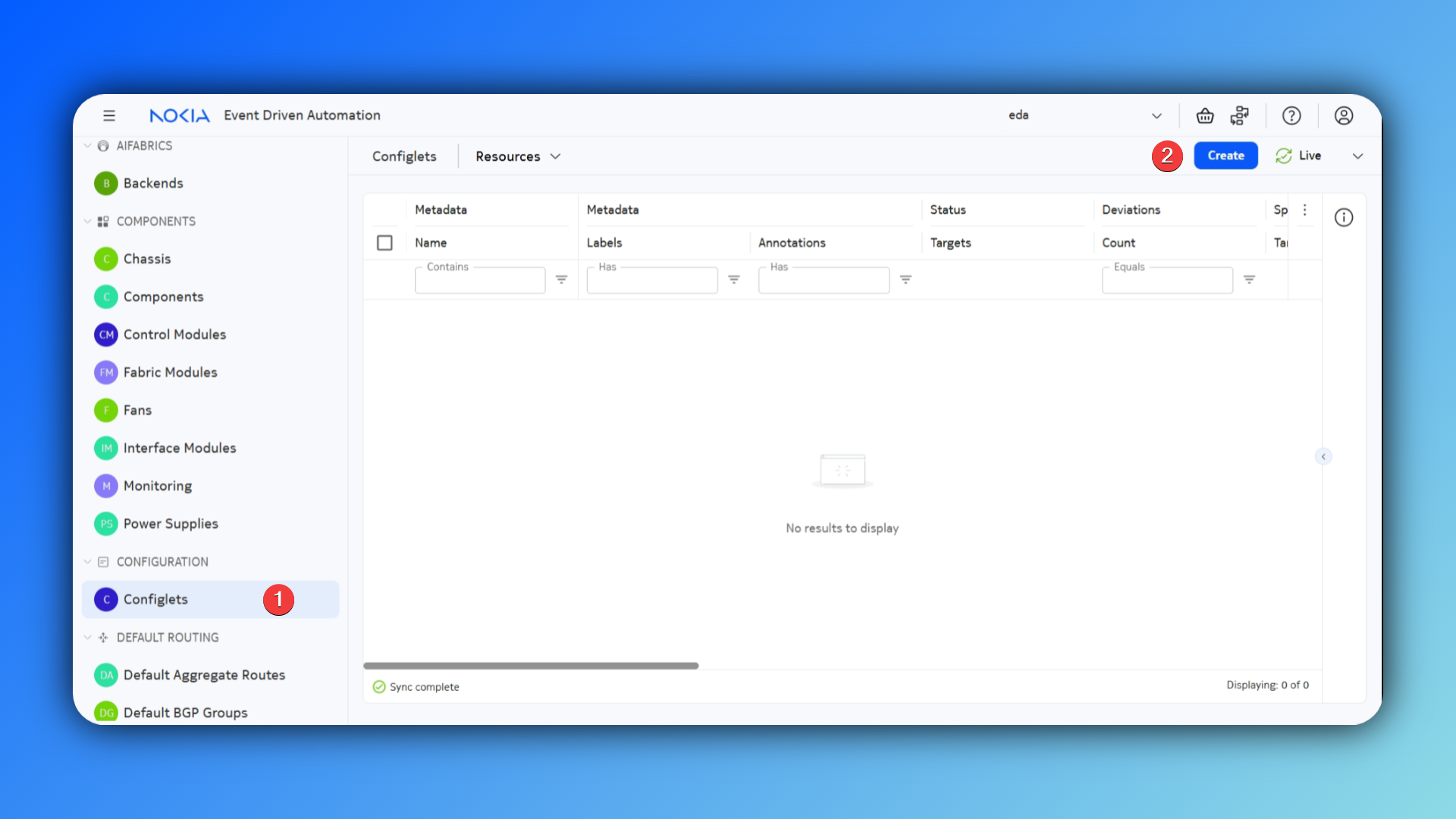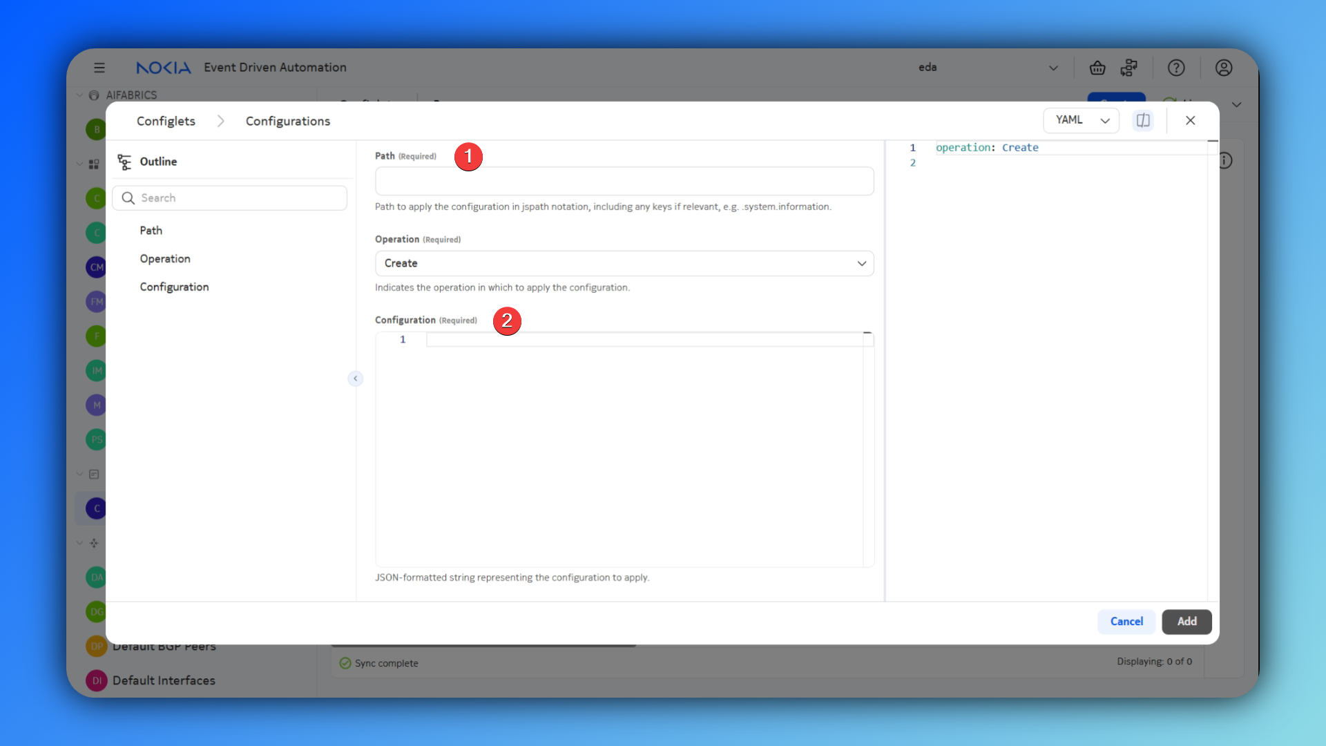 Translate these config snippets into EDA Configlets to easily deploy this configuration on multiple nodes. To achiieve this, the steps involve: