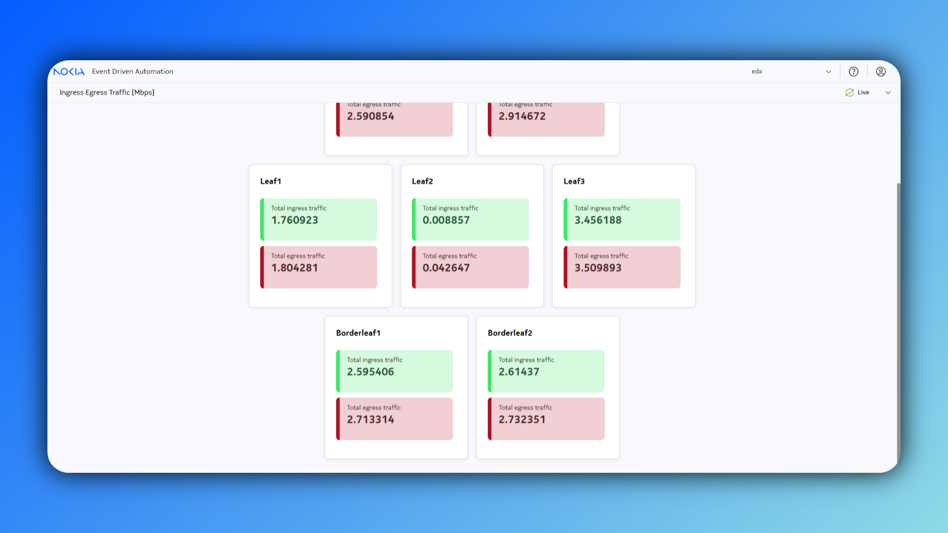 In EDA, you can also build custom dashboards. This allows you to create visualizations of your network's state information for specific use-cases. In this case, we are interested in the ingress traffic distribution between the different leaf nodes. We've prepared such a dashboard for you, it can be found at Dashboards